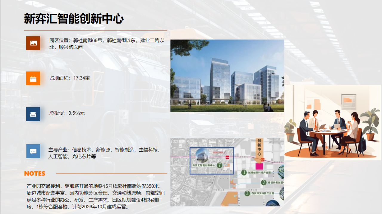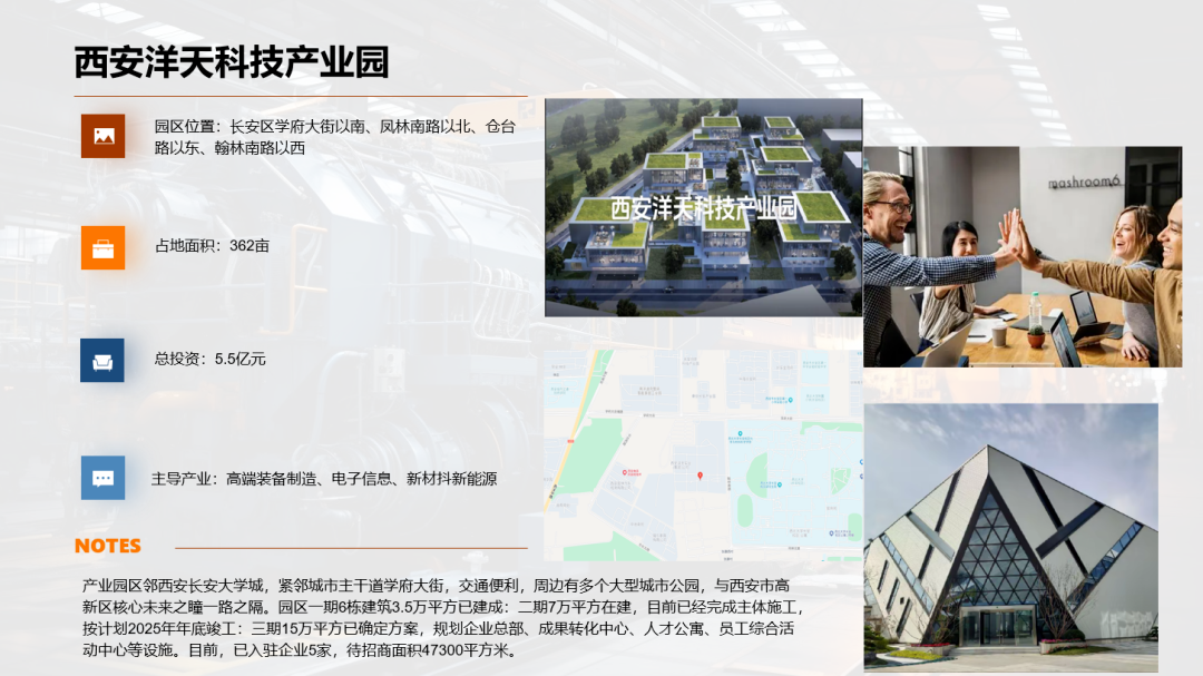 项目紧密呼应西安市产业总体布局,深度融入长安区现代产业体系建设,着力打造契合区域发展导向的综合性科技园区。园区以智能科创产业集聚与融合发展为目标,突出示范引领作用,聚焦为中小企业成长提供高品质、高标准的发展载体,涵盖智能产品研发、科研办公、创新孵化等多元功能,致力于建设成为集创新活力、产业协同与绿色生态于一体的现代化科技产业园区。