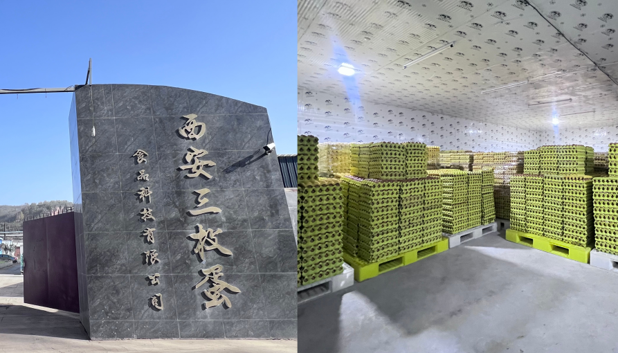 【西安市三枚蛋食品科技有限公司总经理谢宽宽:这个是我们的原料保鲜库,我带大家来参观一下。这个是我们的保鲜库,主要用于存放五天以内的无抗生素的鲜鸡蛋。这个冷库的容量能达到80吨,它常年的温度保持到0~3度。】