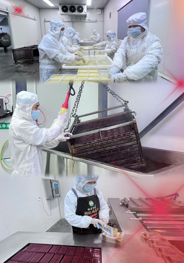 记者在鸣犊街道半引路找到了“美食制造工厂”,负责人谢宽宽告诉记者,鲜鸡蛋干的制作工艺既精细又严苛,每一个环节都是在人工操作、监管的基础上赋予现代科技的加持,才打造出无可复制的独特美味。谢宽宽说着就带记者穿上工作服、鞋套等装备来到了洁净生产车间。映入眼帘的是所有工作人员全副武装在干净卫生的工作间,有序地操作着现代化生产设备,最让记者感叹的是满眼的鸡蛋。