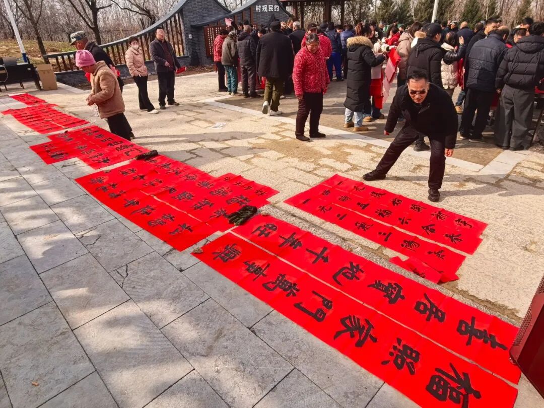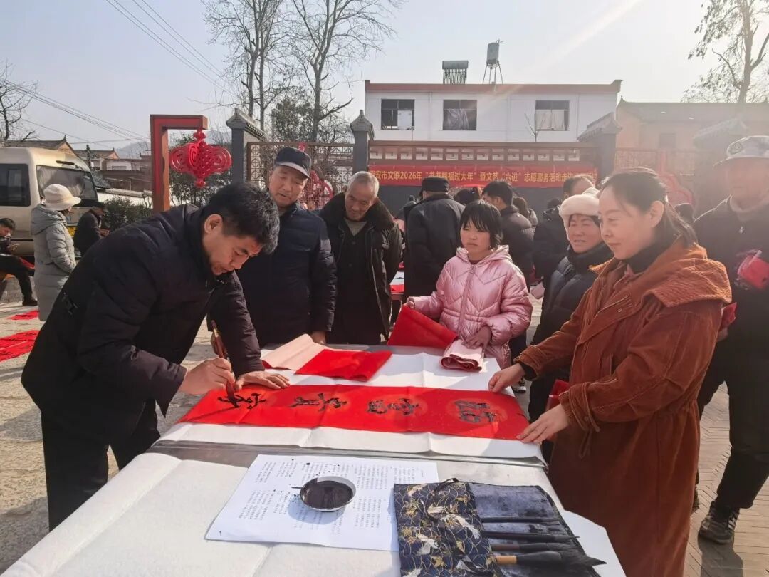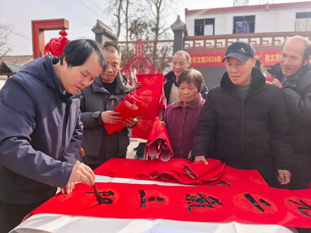活动现场,市文联、市书协十余位书画艺术家与区文联携手,铺展红纸,饱蘸浓墨,挥毫创作。楷、行、隶、篆各展风姿,“福满华堂添寿喜,春融盛景纳吉祥”等寓意吉祥的词句跃然纸上,融入了大家对马年的美好祝愿。活动还专门设置了拍摄角,文艺志愿者用镜头为村民定格团圆瞬间。村民们围聚案旁,或细选心仪联句,或请艺术家定制专属祝福,拿到墨迹未干的春联时笑意盈盈,纷纷称赞这是“最有年味的新春礼物”。