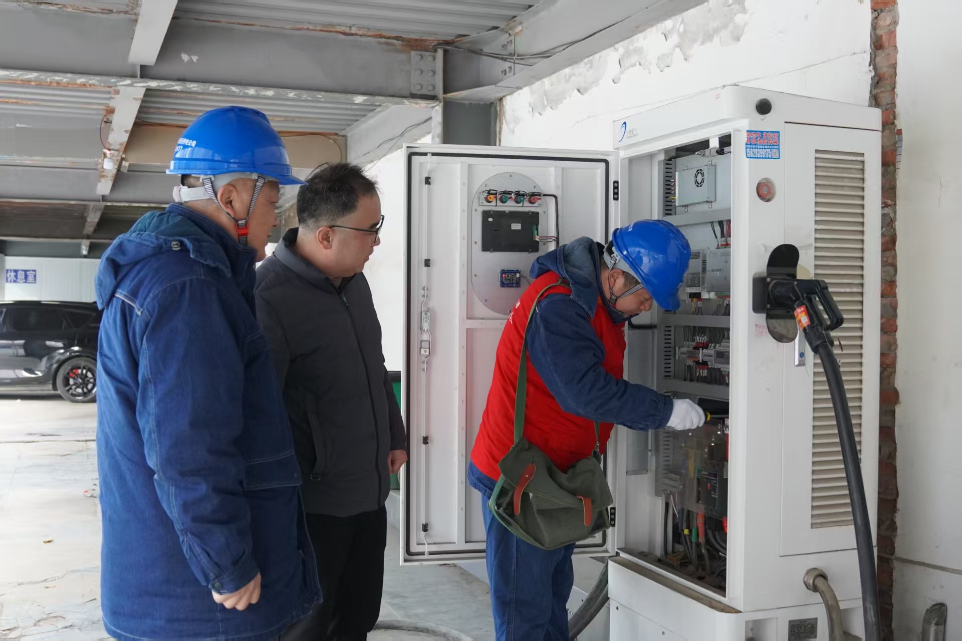 话音刚落,队员刘磊和张家俊便迅速行动起来。他们手持验电笔、测温枪等专业工具,为充电桩做起了全方位的“电力体检”。