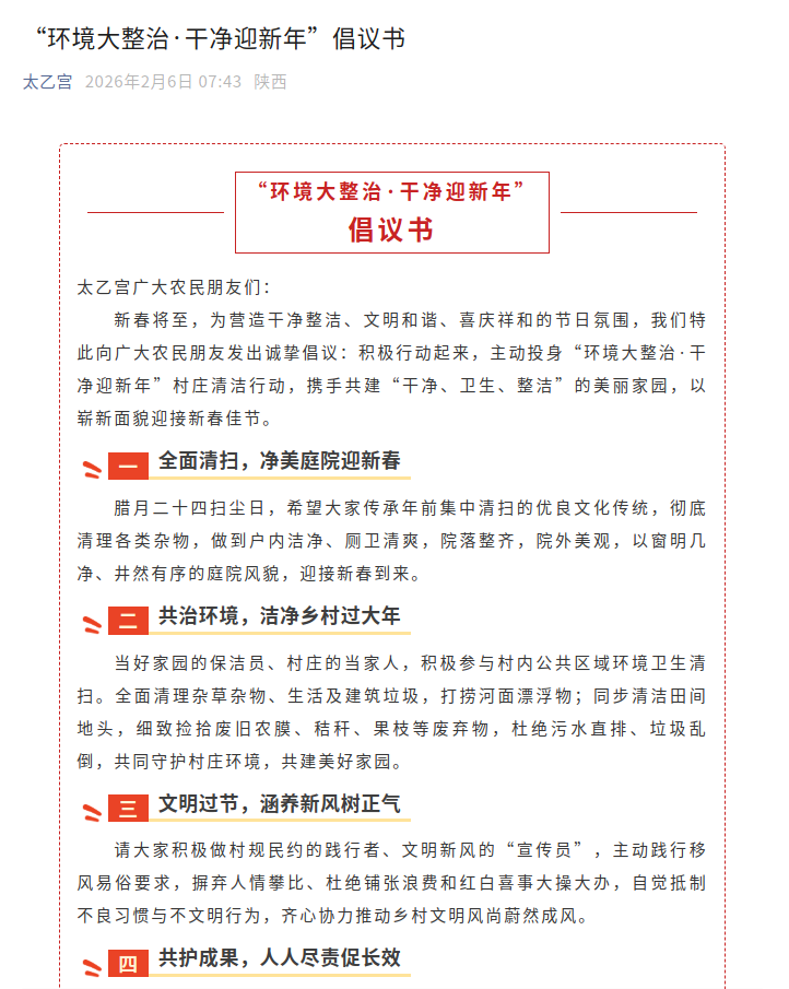 环境整治不仅擦亮了乡村的“颜值”,更涵养了文明的“气质”。太乙宫街道将环境整治与文明乡风培育同步推进,在引导群众扫尘迎新的同时,倡导大家自觉践行村规民约、主动移风易俗,摒弃人情攀比、杜绝铺张浪费,抵制红白喜事大操大办等不良风气,让干净整洁的环境成为文明乡风的“底色”,让文明过节的理念深入人心。