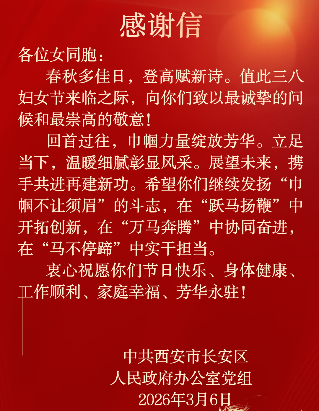 三月芳菲,灼灼韶华。在第116个“三八”国际妇女节来临之际,长安区政府办公室党组开展系列主题活动,激发女干部职工砥砺巾帼之志、贡献巾帼之力、涵养巾帼之美,以新担当新作为新气象,不断提升“三服务”工作质效,为加快建设西部强区、奋力打造世界一流航天新城贡献巾帼力量。
