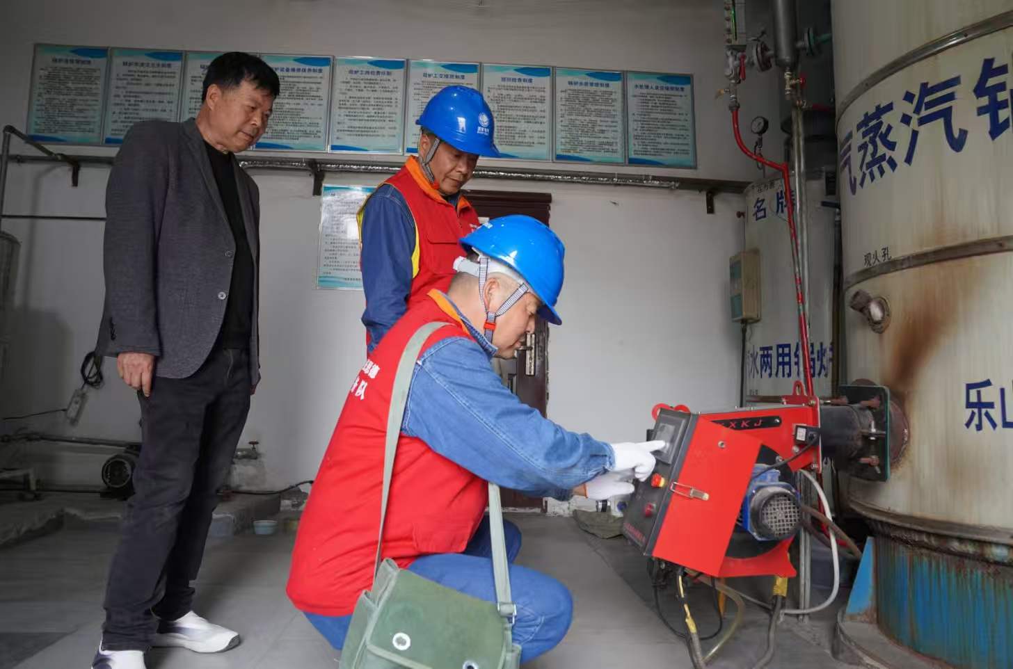 刚跨进厂区大门,队员们便闻到浓浓的酱香味儿。该食品厂主要生产黄豆酱、甜面酱等调味品,送往周边学校、医院等地,目前也开通了网购渠道,深受消费者喜爱。走进厂区,队员们立刻就进入了“战斗状态”。他们沿着生产流水线的脉络,把锅炉房、蒸面机、曲房、风机、浓浆泵等核心设备挨个“过筛子”。“您瞧这个线路接头,已经有点松动了,锅炉房常年高温,时间长了容易发热‘罢工’,得赶紧给它‘紧一紧’!”队员孟伟蹲在配电箱旁,一边指着接线端子给食品厂负责人“诊断”隐患,一边掏出工具动手“治病”。在曲房的风机旁,队员们像给设备“量体温”一样,仔细检测电机运行温度和线路负荷,确保这个决定发酵环境的“心脏”稳定跳动;蒸面机旁,他们反复核验接地装置,从根源上切断漏电隐患的苗头。