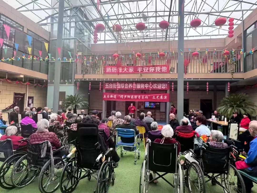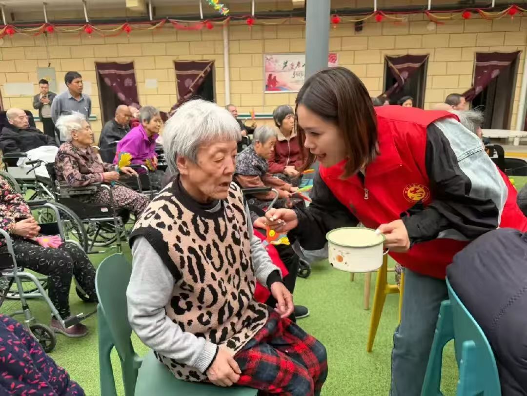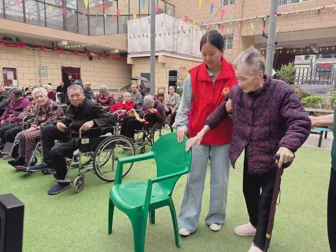 在秦腔演出热闹进行的同时,身穿红马甲的志愿者们在老人中间穿梭忙碌,成为院里最亮眼的“暖色调”。看到腿脚不便的老人,他们主动上前搀扶,细心帮助调好座椅、掖好外套;担心老人口渴,便端来温开水,一口一口耐心喂他们喝;遇到有疑问的老人,志愿者便蹲下身来,贴近耳边仔细倾听、认真解答。