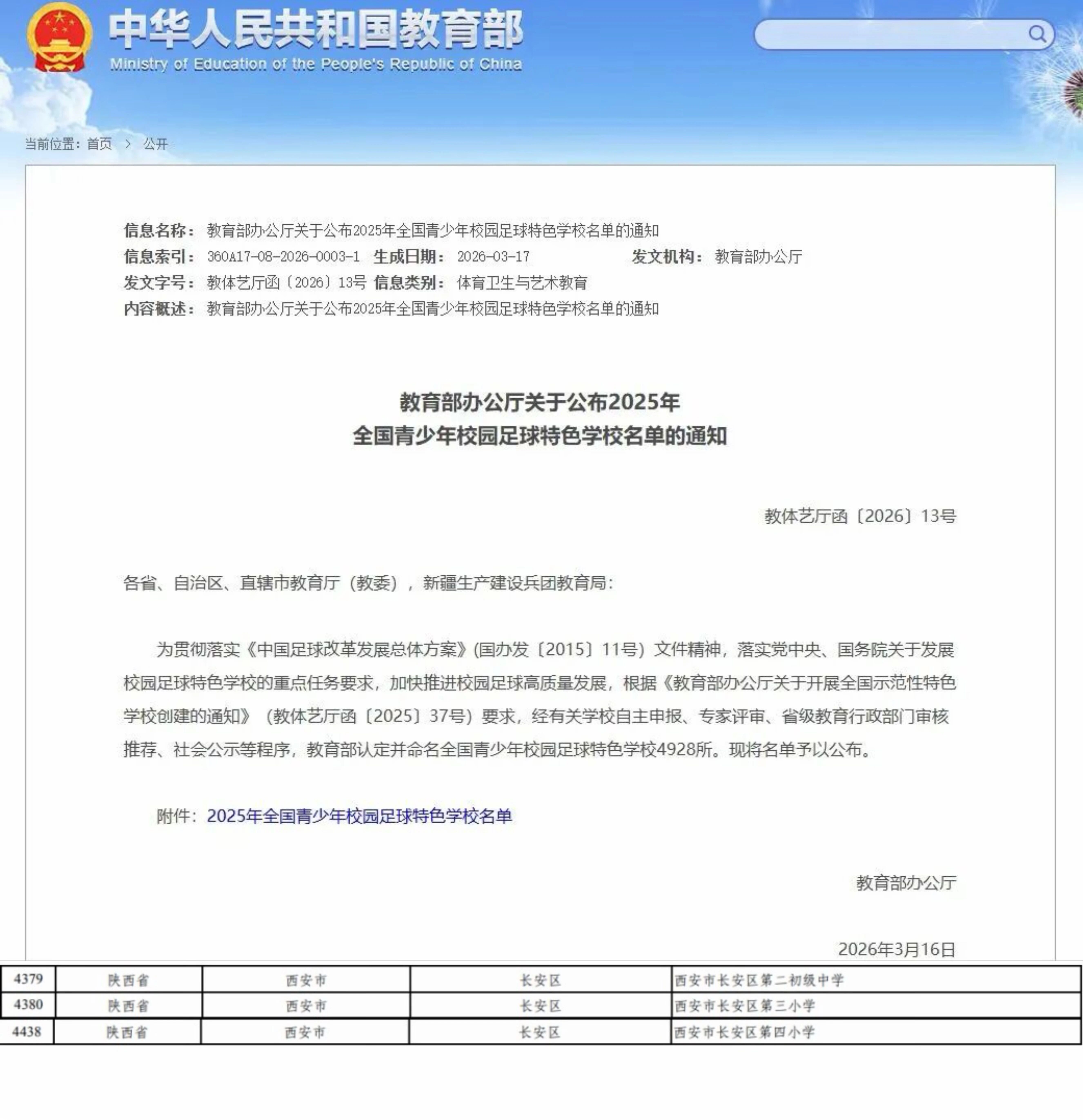 近日,教育部办公厅印发《关于公布2025年全国青少年校园足球特色学校名单的通知》,经学校申报、专家评审、逐级审核推荐、社会公示,长安区第二初级中学、长安区第三小学、长安区第四小学被教育部认定并命名为2025年度全国青少年校园足球特色学校。